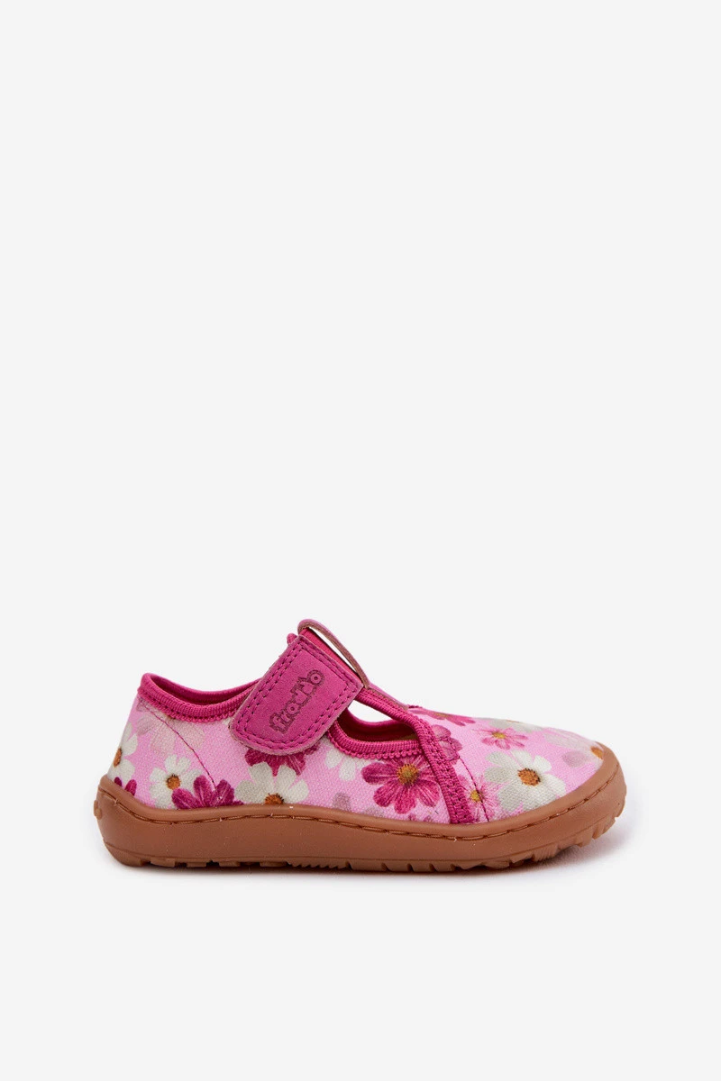 Dětské domácí pantofle na suchý zip s květinovým vzorem Barefoot Froddo Cannvas G1700439-4 Růžové