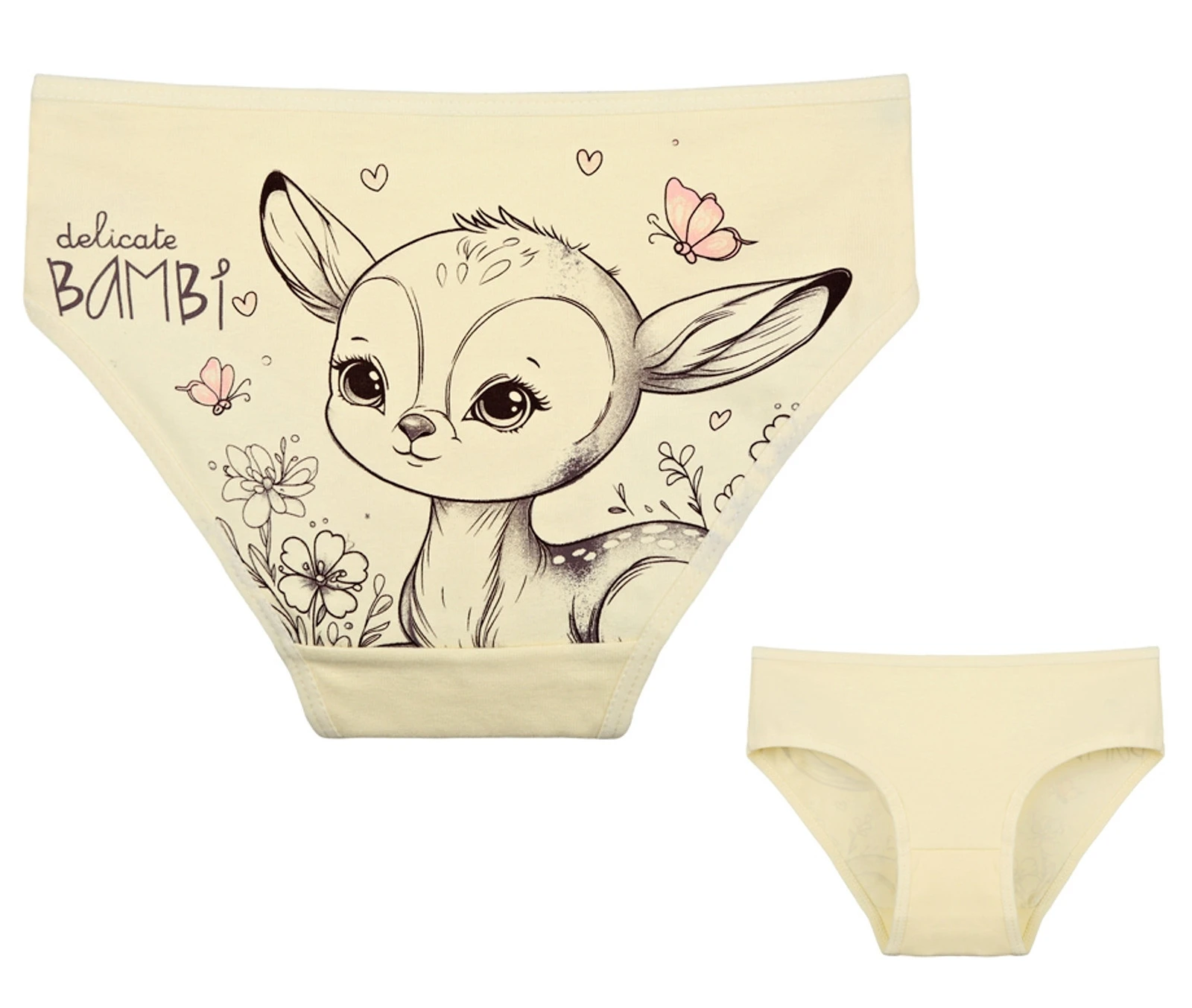 Dětské bavlněné kalhotky Bambi. Dětské kalhotky klasického střihu jsou pohodlné a slušivé, zdobí je obrázek malé srnečky. Obzvláště oceníte materiálové složení - 95% bavlna a 5% elasten. Použitý materiál je příjemný a poddajný na dotek.