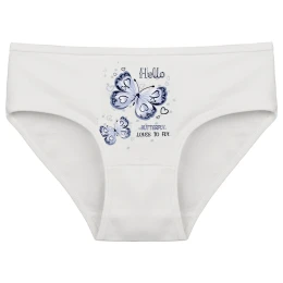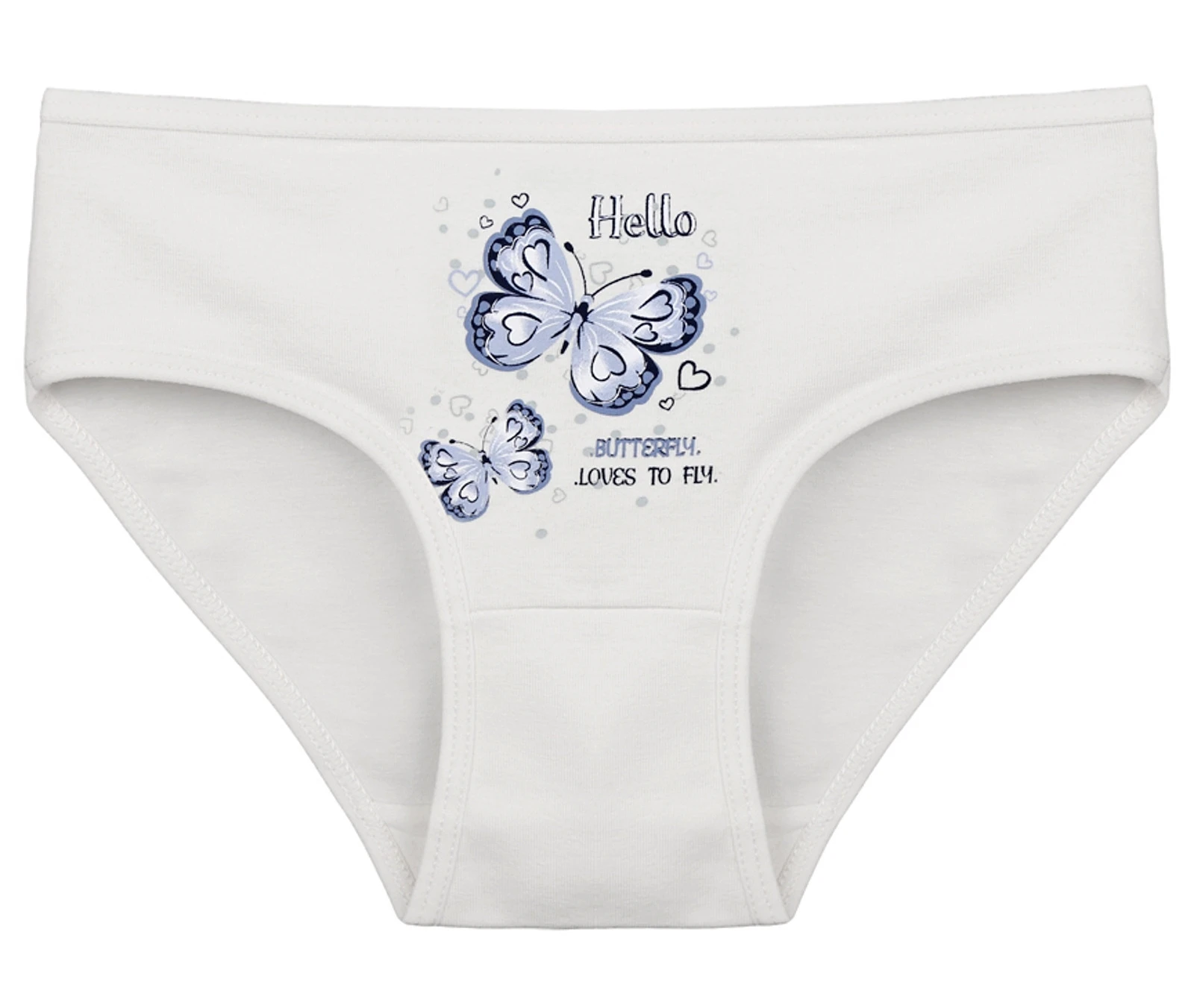 Dětské bavlněné kalhotky Butterfly. Dětské kalhotky klasického střihu jsou pohodlné a slušivé, zdobí je obrázek motýlků. Obzvláště oceníte materiálové složení - 95% bavlna a 5% elasten. Použitý materiál je příjemný a poddajný na dotek.