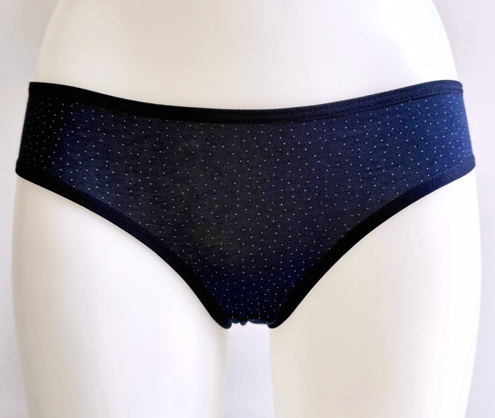 Dětské bavlněné kalhotky Kamila. Tmavě modré kalhotky klasického střihu jsou pohodlné a slušivé, zdobí je malé puntíky. Obzvláště oceníte materiálové složení - 95% bavlna a 5% elasten. Použitý materiál je příjemný a poddajný na dotek.