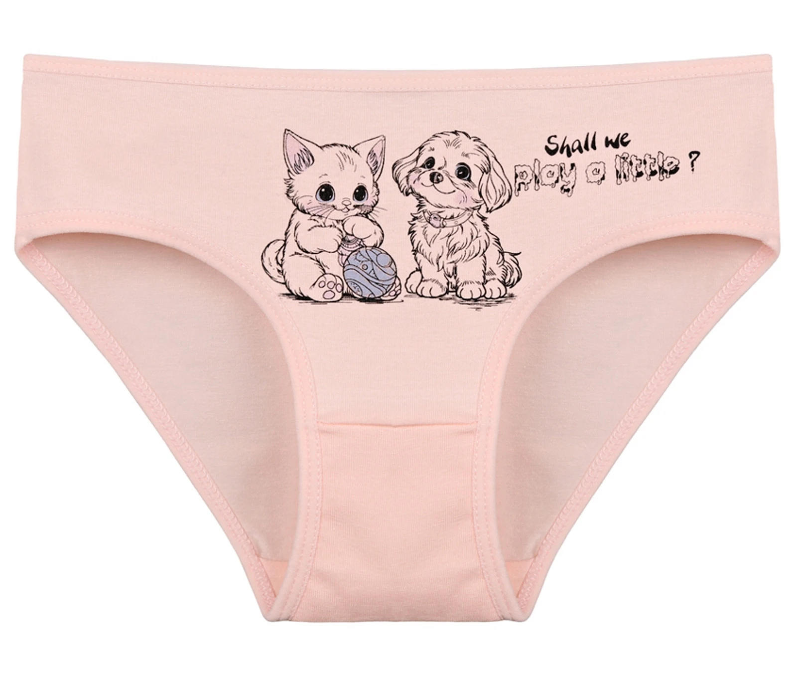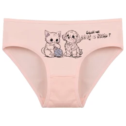 Dětské bavlněné kalhotky Olivia. Dětské kalhotky klasického střihu jsou pohodlné a slušivé, zdobí je obrázek kotěte se štěňátkem. Obzvláště oceníte materiálové složení - 95% bavlna a 5% elasten. Použitý materiál je příjemný a poddajný na dotek.