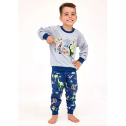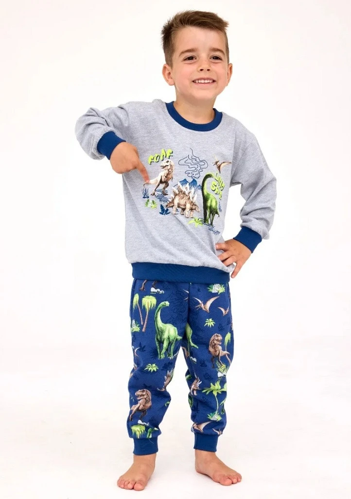 Pohodlné dětské pyžamo s dlouhými rukávy a nohavice zakončené pružnými manžetami, kalhoty mají širokou vkládanou gumu v pase. Tričko je světle, s dlouhým rukávem a potiskem dinosaurů. Kalhoty jsou vzorované, nejčastěji v modrém tónu.