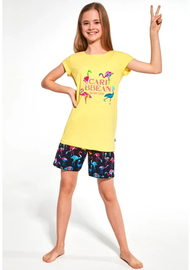 Dětské pyžamo značky Cornette. Pyžamo se skládá z trička a kraťasů. Tričko má krátký rukáv a výstřih je do kulata. Na přední části je natištěná aplikace s plameňáky. Kraťasy mají pružný a pohodlný pás. Kraťasy jsou tmavě modré barvy a jsou celé potištěné barevnými plameňáky.