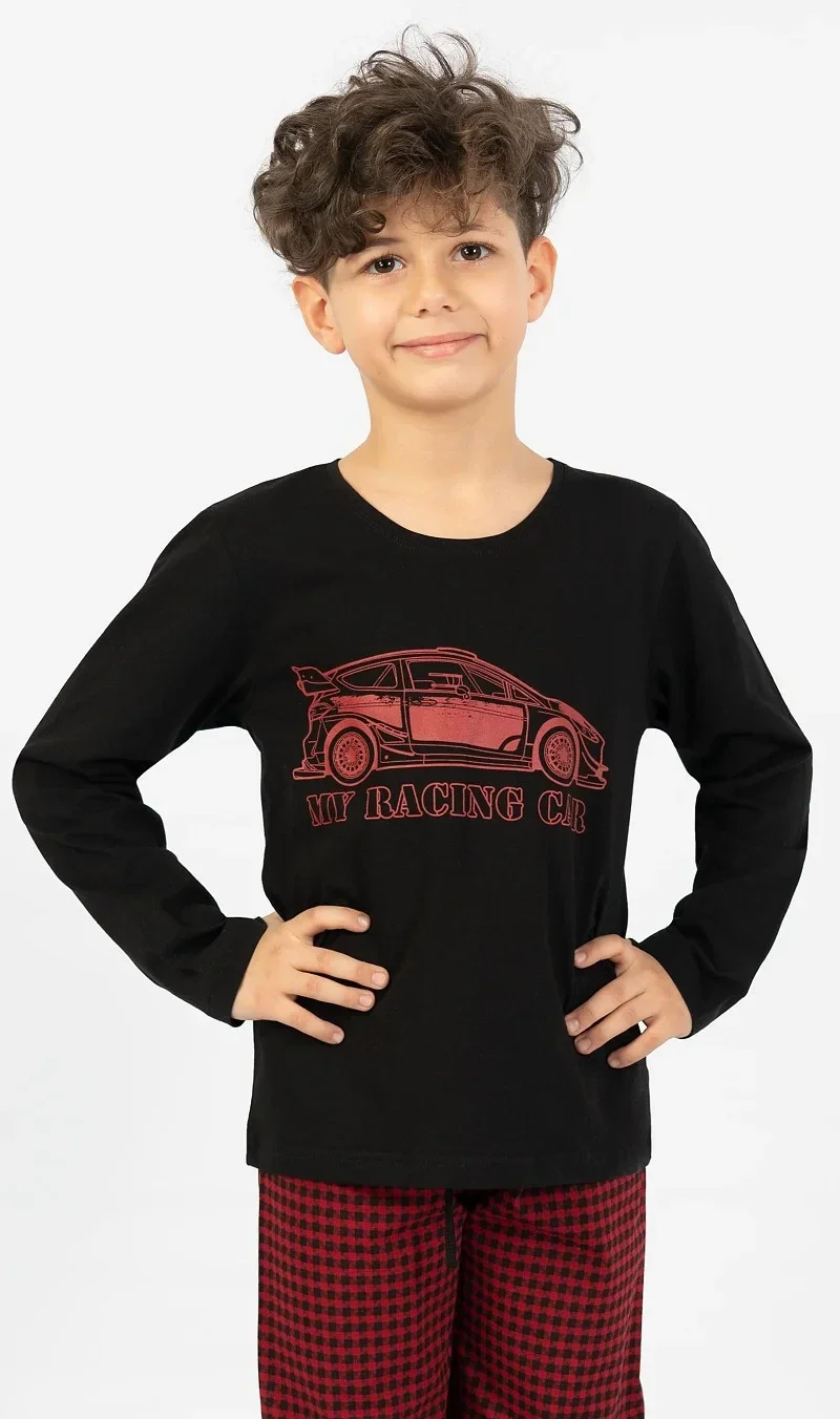 Dětské bavlněné pyžamo dlouhé Car. Dětské pyžamo se skládá z trika s dlouhým rukávem a dlouhých kalhot. Na jednobarevném triku je obrázek závodního auta s nápisem 'My racing car'. Triko doplňují dlouhé kostkované kalhoty, které mají v pase gumu a šňůrku na stažení, nemají kapsy. Použitý bavlněný materiál je příjemný a poddajný na dotek.