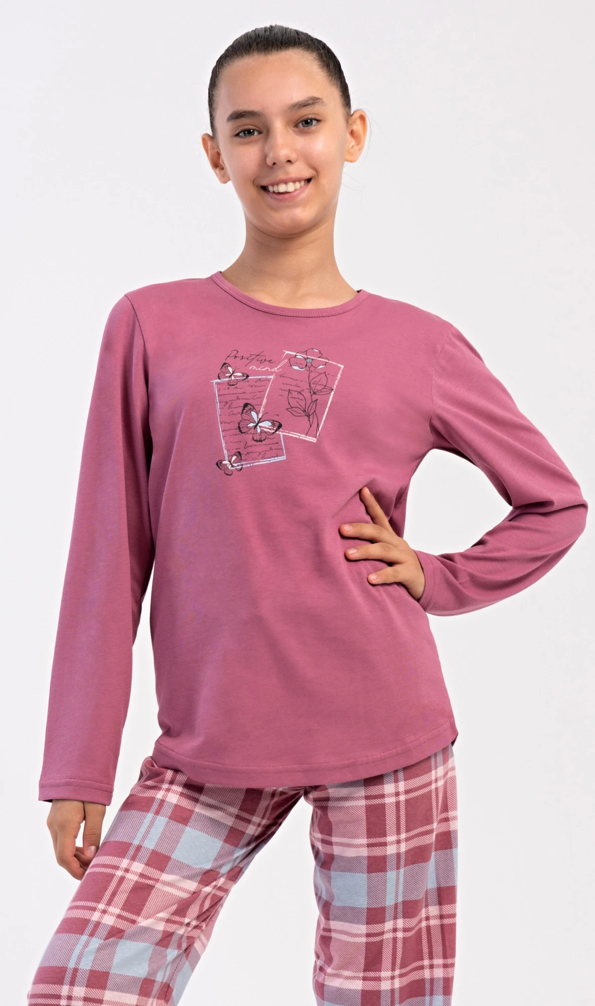 Dětské bavlněné dlouhé pyžamo Charlotte. Dívčí pyžamo se skládá z trika s dlouhým rukávem a dlouhých kalhot. Triko s kulatým výstřihem je ozdobeno obrázky motýlů. Kárované kalhoty mají v pase gumu a šňůrku na stažení, nemají kapsy. Použitý bavlněný materiál je poddajný a příjemný na dotek.