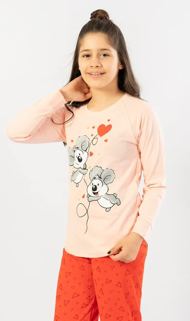 Dětské bavlněné pyžamo dlouhé Koaly. Dětské pyžamo se skládá z trika s dlouhým rukávem a dlouhých kalhot. Na triku je velký obrázek dvou roztomilých koal, které letí na balónku. Koaly obklopují srdíčka a hvězdičky. Motiv srdíček a hvězdiček se opakuje i na dlouhých kalhotách, které jsou zkončeny panty. Kalhoty mají v pase gumu a šňůrku na stažení, nemají kapsy. Použitý bavlněný materiál je příjemný a poddajný na dotek.