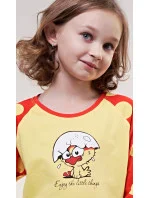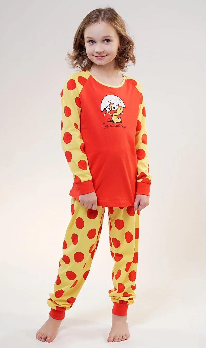 Dětské bavlněné pyžamo dlouhé Malé kuře. Pyžamo se skládá z trička s dlouhým rukávem a dlouhých kalhot. Na tričku je obrázek roztomilého kuřátka se skořápkou na hlavě, pod kterým je nápis Enjoy little things. Tričko má barevně odlišené rukávy, které jsou potištěny velkými puntíky. Puntíky jsou potištěny i dlouhé kalhoty. Použitý bavlněný materiál je příjemný a poddajný na dotek.