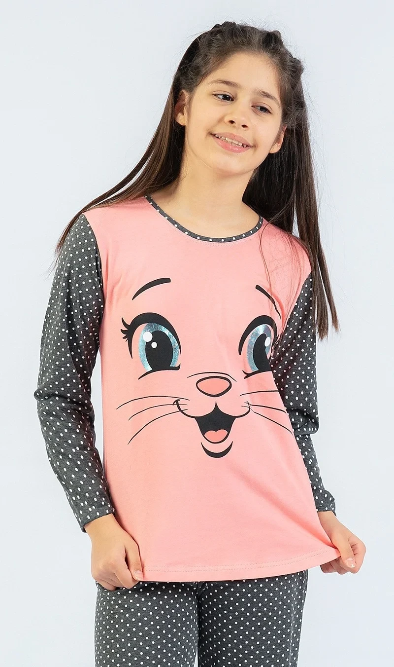 Dětské pyžamo dlouhé Malý miláček. Dětské pyžamo se skládá z trika s dlouhým rukávem a dlouhých kalhot. Jednobarevné triko má barevně odlišené puntíkované rukávy a na hrudi obrázek tváře kočky. Puntíkované kalhoty mají v pase gumu, nemají kapsy. Použitý materiál je příjemný a poddajný na dotek.