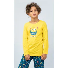 Dětské bavlněné pyžamo dlouhé Monster. Dětské pyžamo se skládá z trika s dlouhým rukávem a dlouhých kalhot. Na triku je obrázek rozesmáté hladové příšerky, podobný motiv se opakuje i na dlouhých kalhotách. Použitý bavlněný materiál je příjemný a poddajný na dotek.