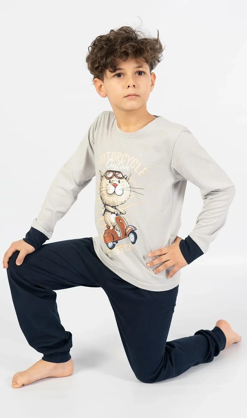 Dětské pyžamo dlouhé Motocycle. Dětské pyžamo se skládá z trika s dlouhým rukávem a dlouhých kalhot. Na triku je obrázek roztomilého kocoura řítícího se na Vespě, kolem kterého je nápis 'Motocycle custom - My style'. Rukávy trika a kalhot jsou zakončené panty. Kalhoty mají v pase gumu, nemají kapsy. Použitý materiál je příjemný a poddajný na dotek. Obsah bavlny u kalhot je 100%, u trika v tyrkysové barvě 100% a u šedého trika 70%.