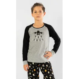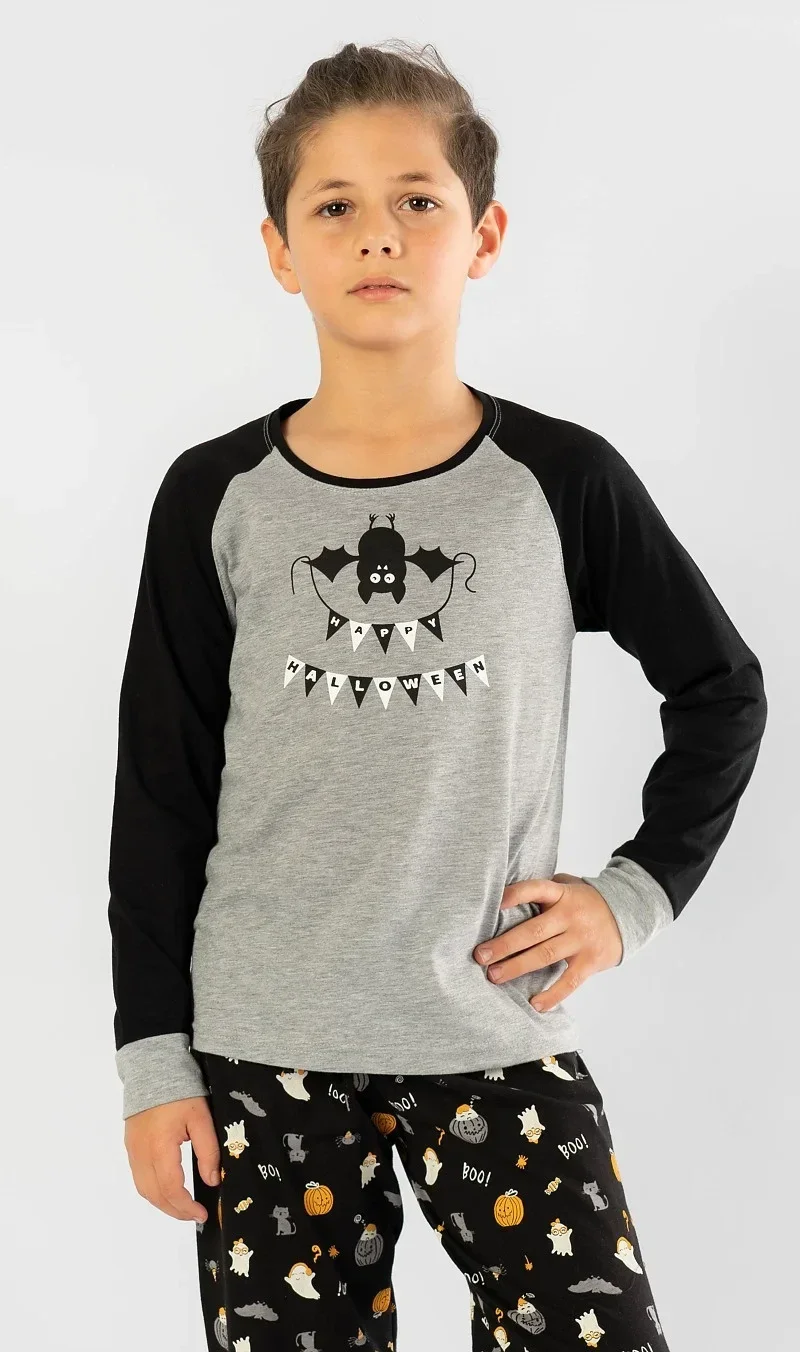 Dětské pyžamo dlouhé Netopýr. Pyžamo se skládá z trika s dlouhým rukávem a dlouhých kalhot. Na triku, které má barevně odlišené rukávy, je obrázek netopýra visícího hlavou dolů a nápis 'Happy Halloween'. Triko a kalhoty jsou zakončeny panty. Kalhoty s halloweenskými motivy mají v pase gumu a šňůrku na stažení, nemají kapsy. Použitý materiál je příjemný a poddajný na dotek. Obsah bavlny u kalhot je 100%, u trika v oranžové barvě 100% a u šedého trika 70%.