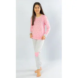 Dětské pyžamo dlouhé Srdíčko. Dětské pyžamo se skládá z trika s dlouhým rukávem a dlouhých kalhot. Triko je potištěno drobnými srdíčky a zakončeno panty v barvě kalhot. Šedé kalhoty jsou také zakončené panty a mají na kolenou falešné záplaty v růžové barvě s potiskem srdíček. Kalhoty mají v pase gumu, nemají kapsy. Použitý materiál je příjemný a poddajný na dotek. Podíl bavlny u trika je 100% a u kalhot 70%.