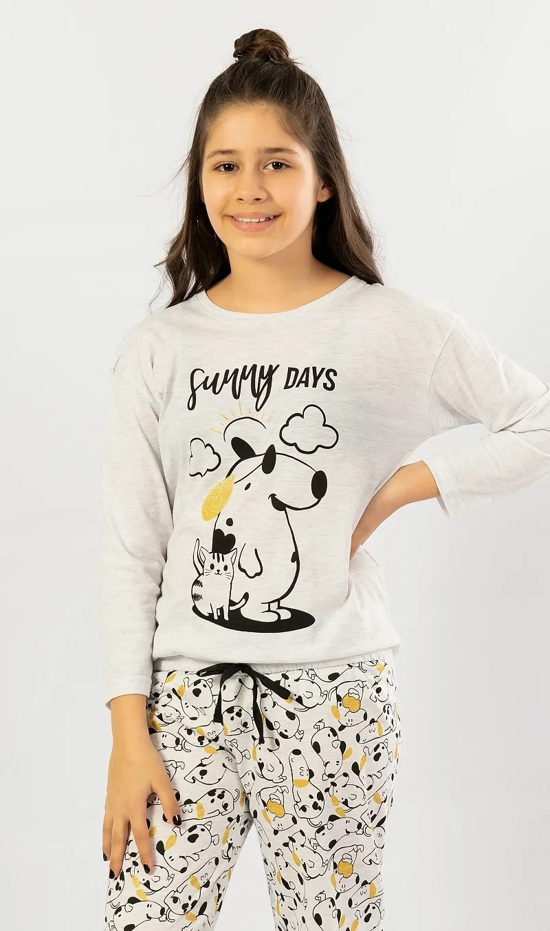 Dětské pyžamo dlouhé Sunny days. Dětské pyžamo se skládá z trika s dlouhým rukávem a dlouhých kalhot. Na triku mikinového typu je velký obrázek pejska a kočičky s nápisem 'Sunny days'. Tričko má ve spodní části gumku se šňůrkou na stažení. Motiv pejska a kočičky se opakuje i na dlouhých kalhotách, které jsou zakončeny lemem. Kalhoty mají v pase gumu a šňůrku na stažení, nemají kapsy. Použitý materiál s podílem bavlny 70% je příjemný a poddajný na dotek.