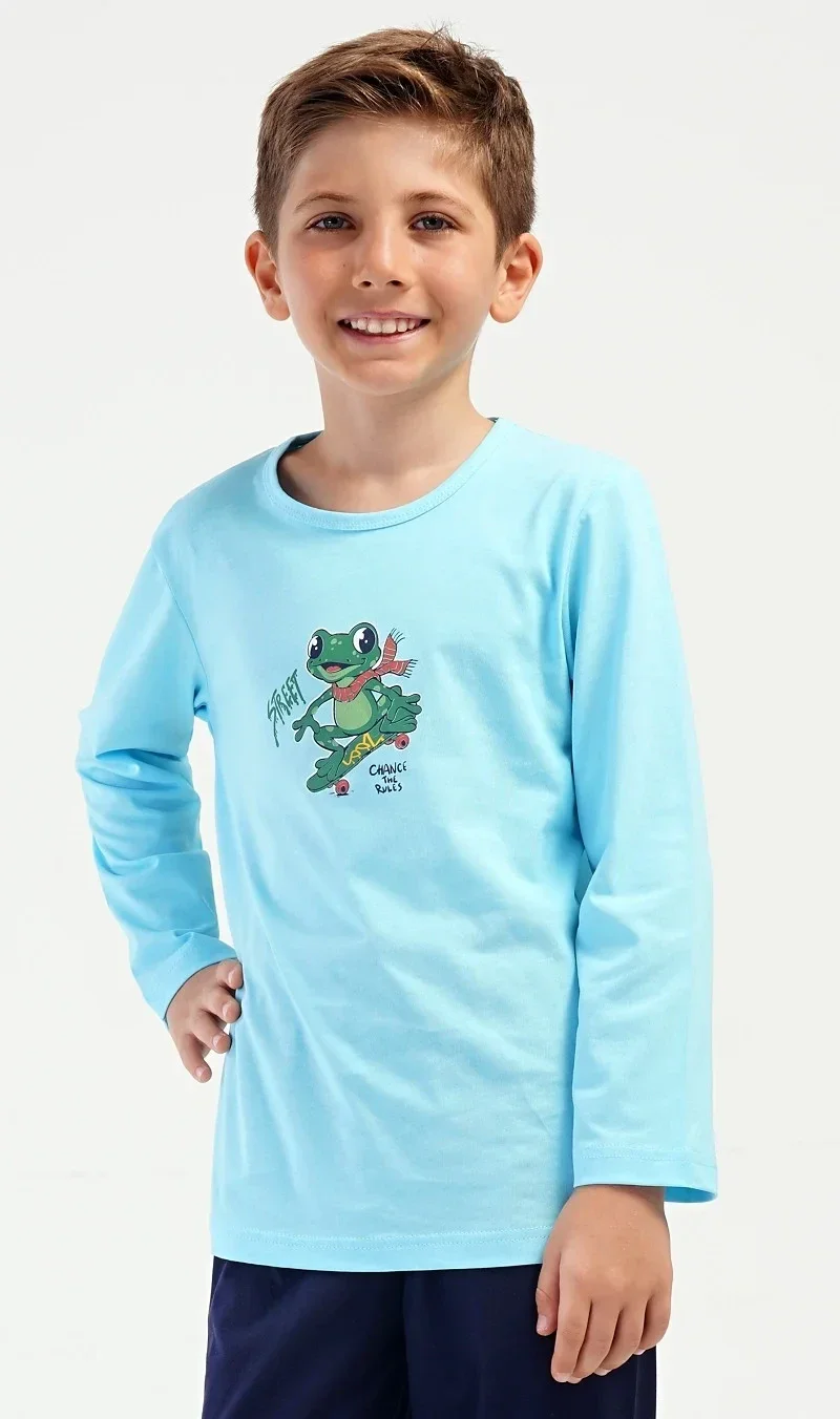 Dětské dlouhé bavlněné pyžamo Žabák. Pyžamo se skládá z trika s dlouhým rukávem a dlouhých kalhot. Na triku s kulatým výstřihem je obrázek veselého žabáka. Jednobarevné dlouhé kalhoty mají v pase gumu na stažení. Použitý bavlněný materiál je příjemný a poddajný na dotek.