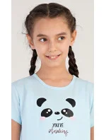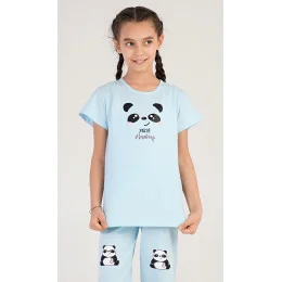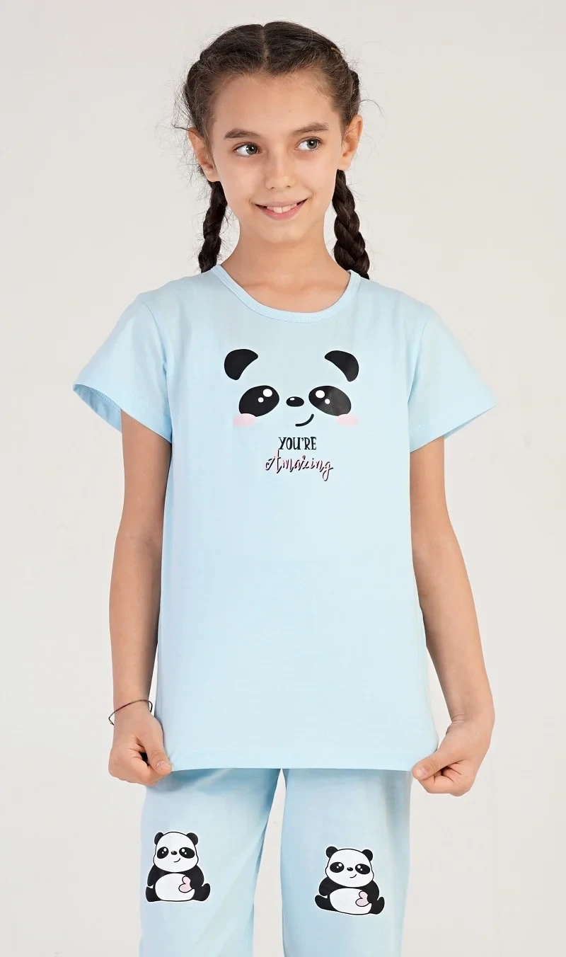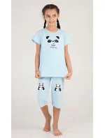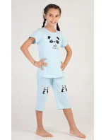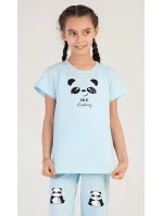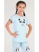 Dětské bavlněné pyžamo kapri Klára. Dětské pyžamo se skládá z trička s krátkým rukávem a tříčtvrtečních kalhot. Jednobarevné tričko zdobí obrázek pandy a drobný nápis. Pandí motiv se opakuje i na kalhotách. Použitý bavlněný materiál je příjemný a poddajný na dotek.
