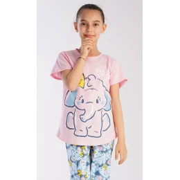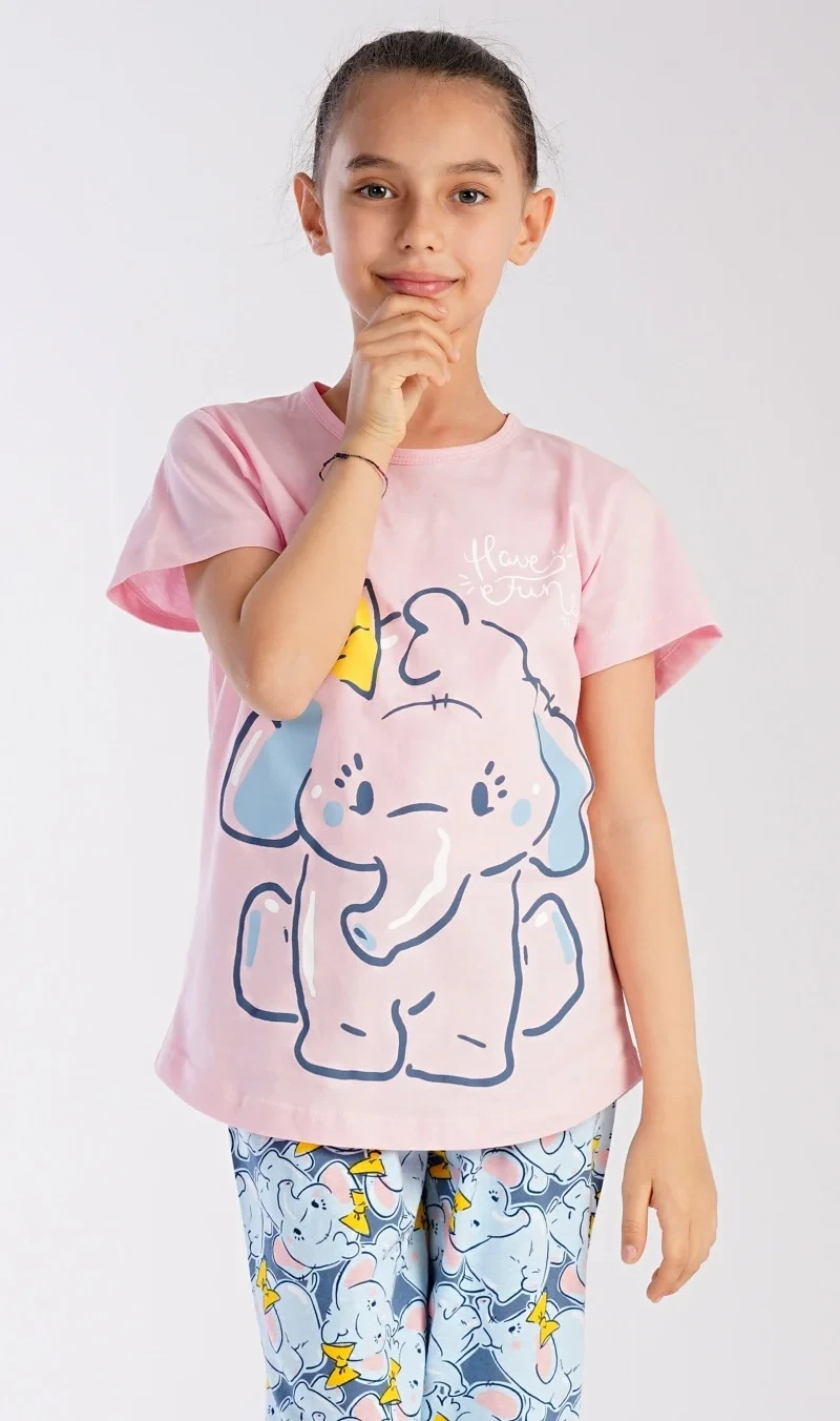 Dětské bavlněné pyžamo kapri Slůně. Dětské pyžamo se skládá z trička s krátkým rukávem a tříčtvrtečních kalhot. Na jednobarevném tričku je velký obrázek slůněte. Tento motiv se opakuje i na kalhotách. Použitý bavlněný materiál je příjemný a poddajný na dotek.