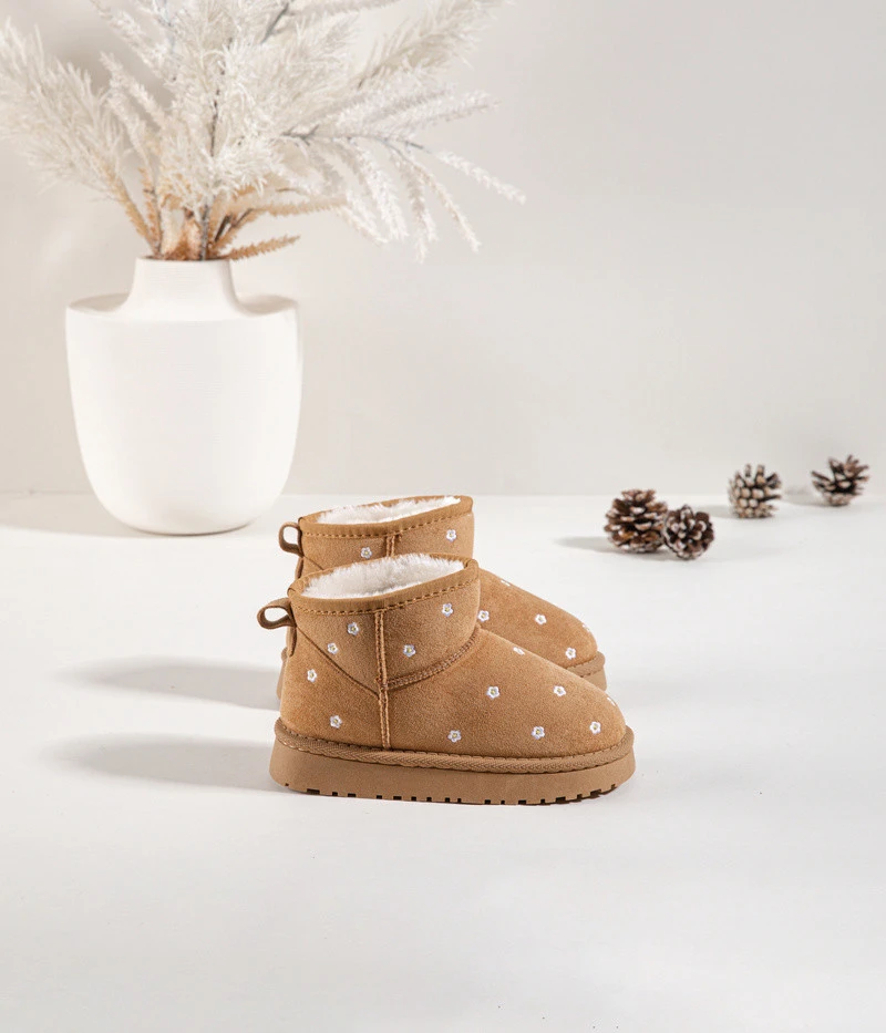 Stylové a hřejivé dětské sněhule Gracina v camel provedení jsou ideální pro zimní období. Boty jsou zdobené jemnými květinovými motivy, které dodávají hravý a veselý vzhled. Měkký vnitřní kožíšek poskytuje výborné teplo a komfort během chladných dní. Praktický střih umožňuje snadné nazouvání a pohodlné nošení, zatímco pevná podrážka zajišťuje stabilitu při chůzi i na kluzkém povrchu.
