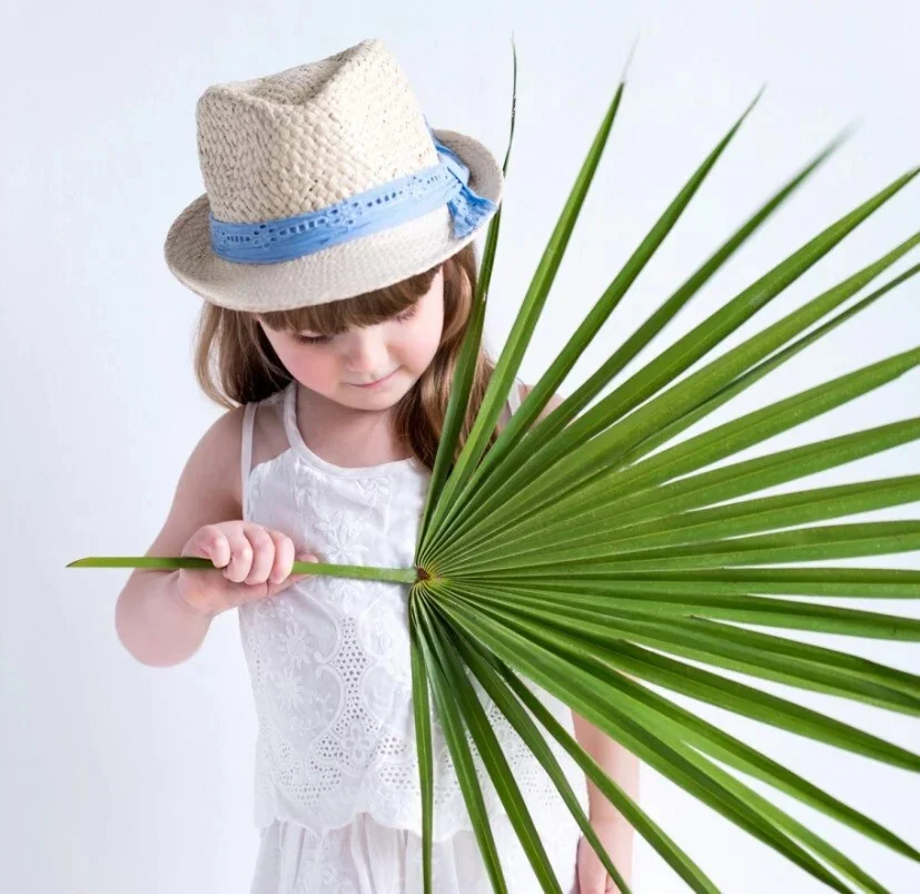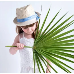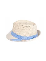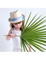 Dětský klobouk s modrou stužkou.