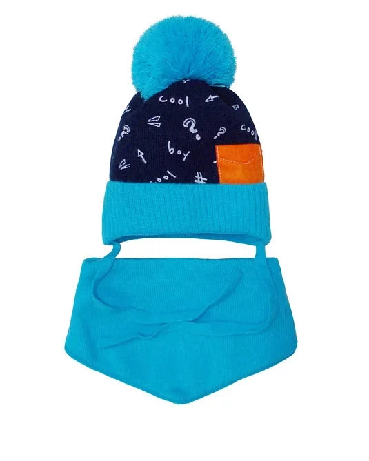 Čepice + šál, vyrobené z teplé, vzorované látky. Zevnitř zdobené teplým rounem. Zdobené malou náplastí a načechranou bambulí. Spletené šňůry pro vázání pod krk na bocích.
