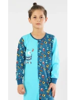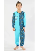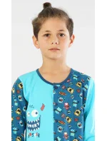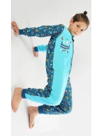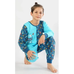 Dětský bavlněný overal Monster. Overal je celopropínací - z jedné strany zdobený obrázkem příšerky a nápisem 'Hungry monster', z druhé strany celoplošným potiskem malých příšerek. Dlouhé nohavice jsou ukončeny elastickými lemy. Bavlněný materiál je poddajný a příjemný na dotek.
