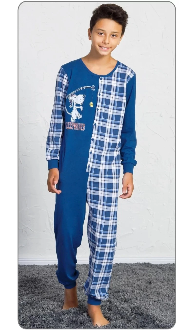 Dětský overal Sleepwalker. Overal je celopropínací z jedné strany zdobený potiskem myšáka, z druhé strany celoplošnou kostkou. Dlouhé nohavice jsou ukončeny elastickými lemy. Bavlněný materiál je poddajný a jemný na dotek. Pyžamo je vhodné i na denní nošení.