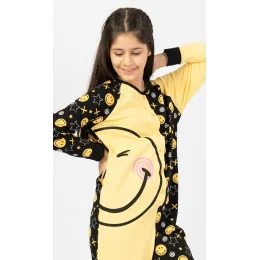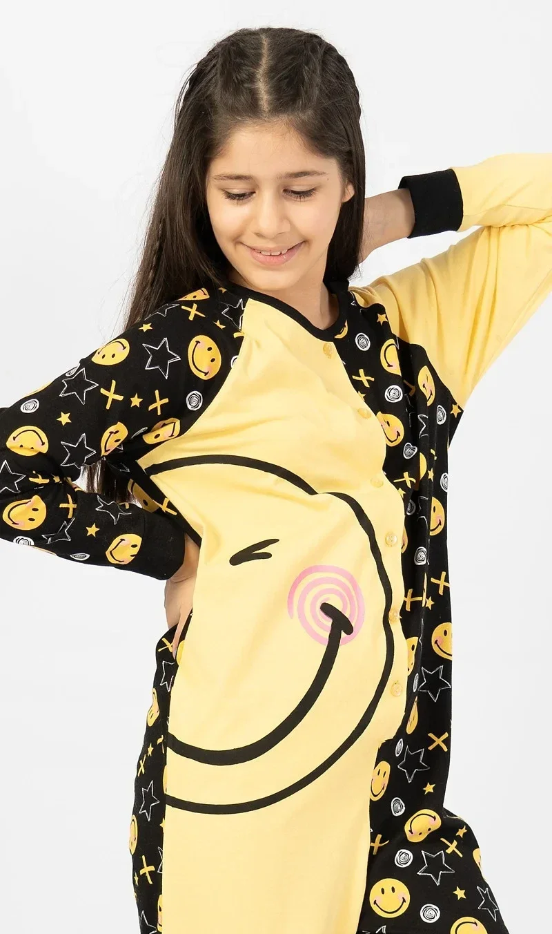 Dětský bavlněný overal Smile. Overal je celopropínací - z jedné strany zdobený velkým obrázkem smajlíka, z druhé strany celoplošným potiskem drobných smajlíků a hvězdiček. Dlouhé nohavice jsou ukončeny elastickými lemy. Bavlněný materiál je poddajný a příjemný na dotek.