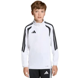 Dětská fotbalová mikina adidas Tiro 26 League Training Top bílá KC3696 Tato dětská fotbalová mikina adidas je ideální na trénink. Zakončená nášivkou na ochranu brady, zapínání na krátký zip. Přizpůsobený střih. Technologie Climacool je funkční řešení, které vás udrží v chladu a suchu a umožní vám soustředit se na hru. Spodní část a manžety zakončené elastickým lemováním. Kontrastní síťované vsadky. Pruhy na rukávech. Jemné logo na hrudi. Materiál: 100% recyklovaný polyester.