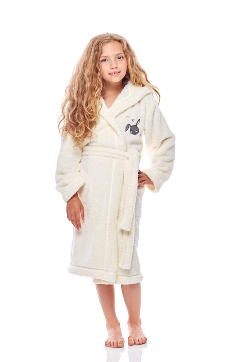 Dětský župan s kapucí z měkkého, na dotek velmi příjemného měkkého úpletu, se stahovací šňůrkou v pase, pohodlnými kapsami na bocích a nášivkou ve tvaru malé mašle na hrudi.