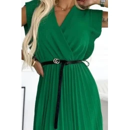 Dámské dlouhé plisované šaty s černým páskem s ozdobnou sponou.