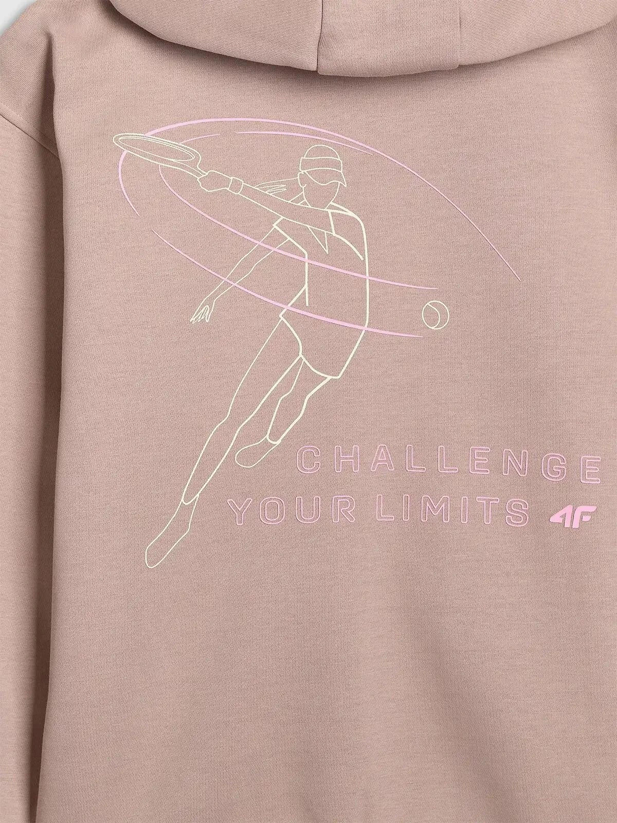 Na hrudi a na zádech je umístěn originální sportovní potisk s motivem tenistky a nápisem „Challenge Your Limits“, který dodává mikině dynamický a motivující charakter.