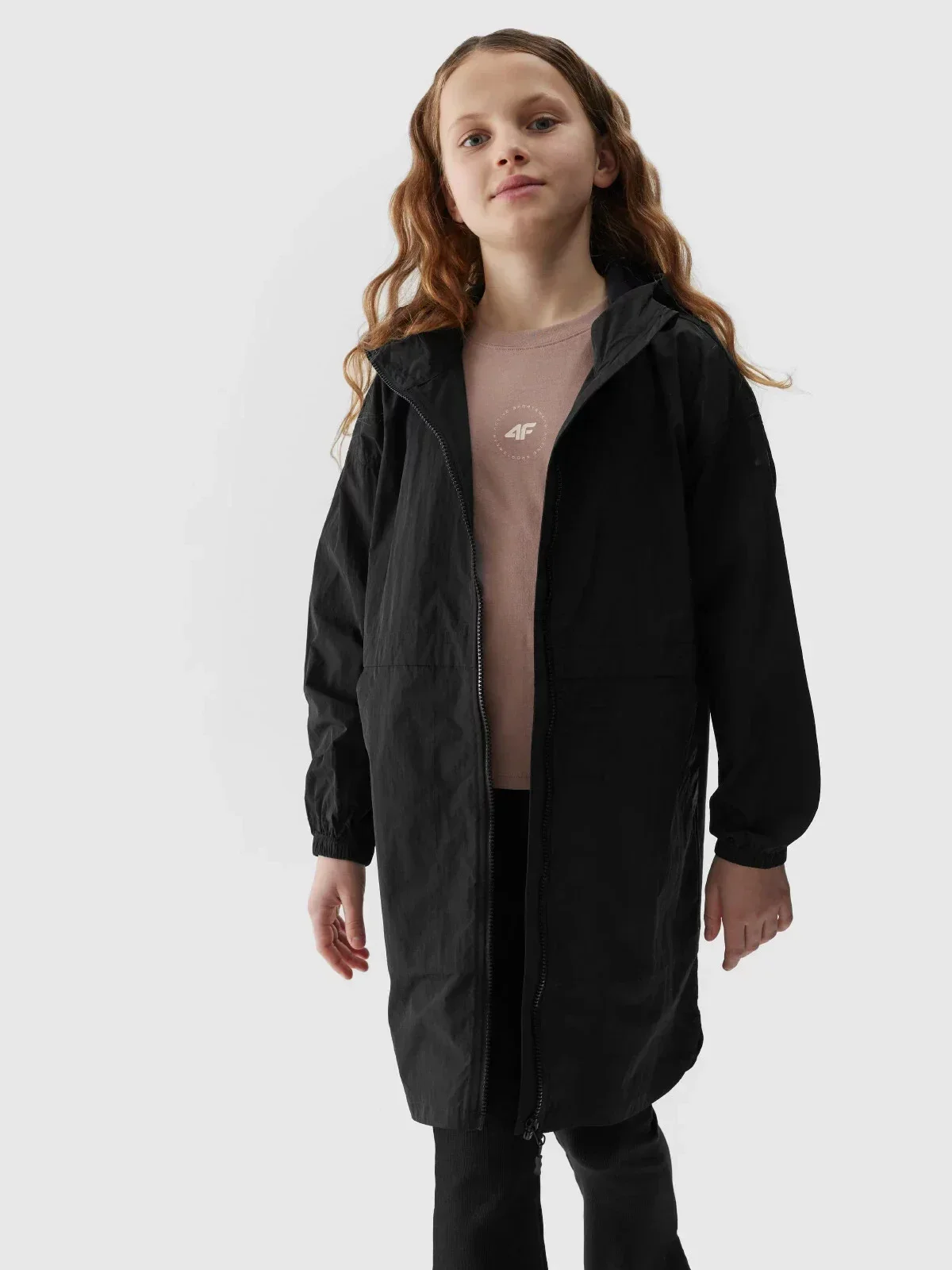 Dívčí dlouhá městská bunda se zapíná na jednosměrný hlavní zip s vnitřní větruodolnou légou, která omezuje pronikání chladu dovnitř bundy.