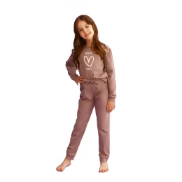 Dívčí pyžamo 2645 TARO - vyrobené z vysoce kvalitní a měkké bavlny - tričko je hnědé barvy s dlouhými rukávy - zdobené barevným potiskem - dlouhé hnědé kalhoty - pohodlná guma v pase