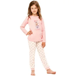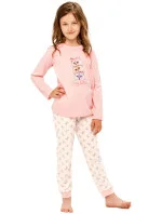 Dívčí pyžamo 3275 Tilly TARO - z vysoce jakostní bavlny - tričko růžové barvy s dlouhými rukávy - zdobené potiskem na přední straně - dlouhé vzorované kalhoty zakončené růžovou manžetou - guma v pase