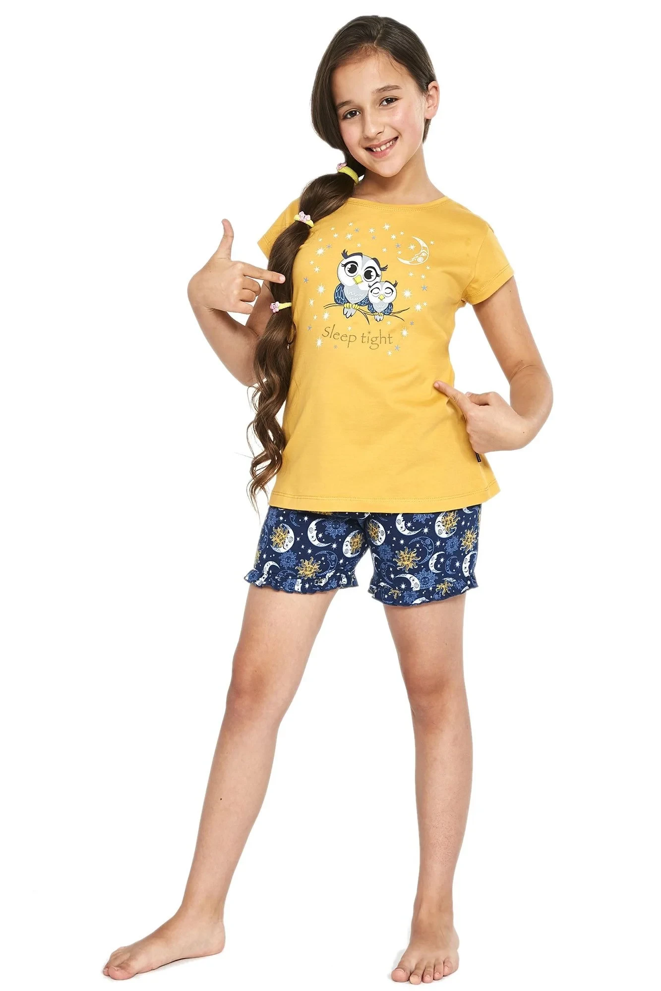 Dívčí pyžamo 488/86 Owls Cornette - bavlněný materiál je poddajný a jemný na dotek - tričko medové barvy s krátkými rukávy - pohodlné vzorované kraťasy - pyžamo je vhodné i na denní nošení