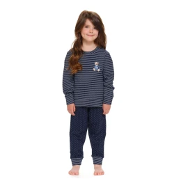 Dívčí pyžamo 5255 plus Doctornap - tmavě modrá barva - vyrobené z velmi kvalitní a příjemné bavlny - pruhované tričko s dlouhými rukávy - na přední straně ozdobené potiskem - dlouhé tamvé kalhoty - certifikát OEKO-TEX Standard 100