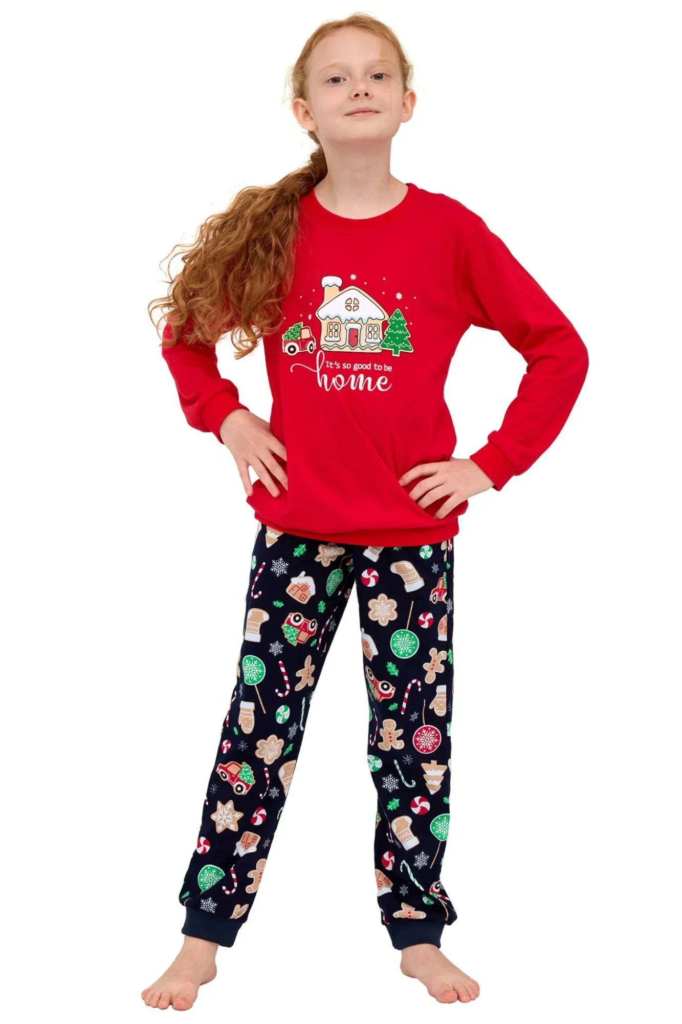 Dívčí pyžamo 592/175 Home CORNETTE - z vysoce jakostní bavlny - červené tričko s dlouhými rukávy - zdobené potiskem na přední straně - dlouhé vzorované kalhoty - vánoční kolekce