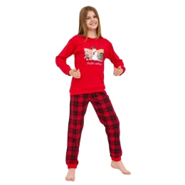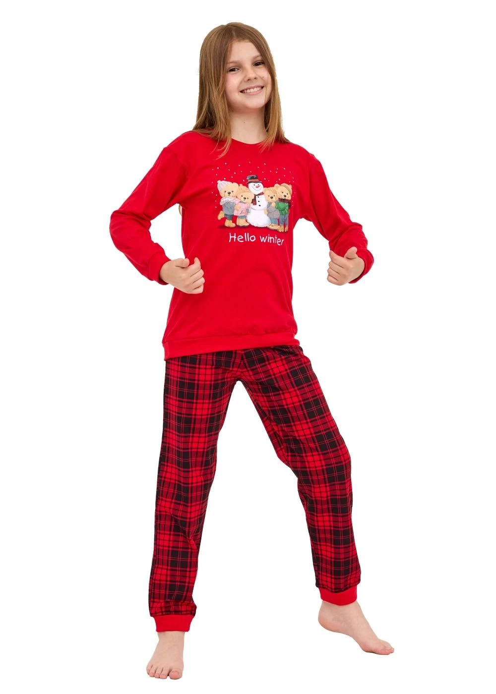 Dívčí pyžamo 592/185 Winter CORNETTE - z vysoce jakostní bavlny - červené tričko s dlouhými rukávy - kulatý výstřih - přední strana ozdobená potiskem - dlouhé kárované nohavice zakončené stahovacím lemem