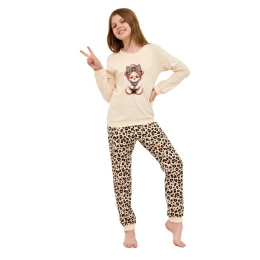Dívčí pyžamo 592/191 Panther CORNETTE - z vysoce jakostní bavlny - béžové tričko s dlouhými rukávy - kulatý výstřih - přední strana ozdobená potiskem - dlouhé vzorované nohavice zakončené stahovacím lemem