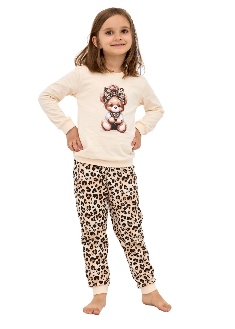 Dívčí pyžamo 594/191 Panther CORNETTE - z vysoce jakostní bavlny - béžové tričko s dlouhými rukávy - kulatý výstřih - přední strana ozdobená potiskem - dlouhé vzorované kalhoty zakončené stahovacím lemem