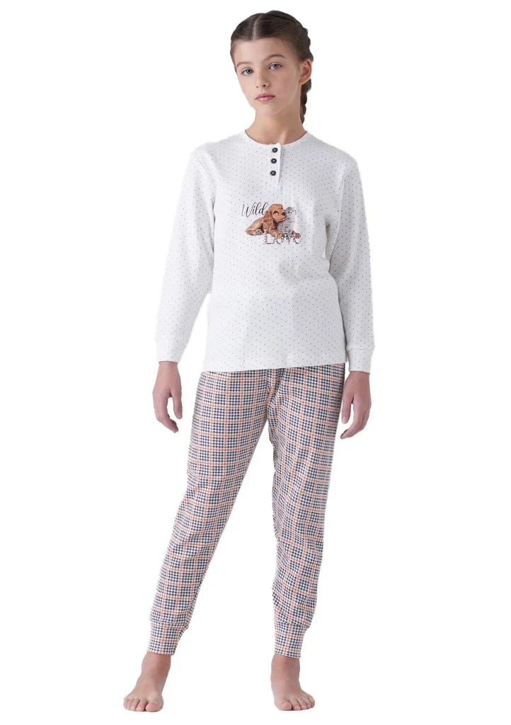 Dívčí bavlněné pyžamo značky Karelpiu. Pyžamo se skládá z trička s dlouhým rukávem, kde na přední straně je natištěná aplikace pejska a kočičky. Okolo krku je kulatý výstřih a léga s třemi knoflíky. Kalhoty jsou v pase do pružné obšité gumy, nohavice jsou ukončené do lemu ze stejného materiálu jako jsou kalhoty. Pyžamo je ušité z jemné, hřejivé bavlny.