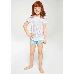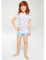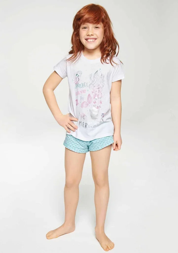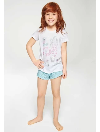 Krásné dětské pyžamko s jemným motivem od značky Muydemi. Pyžamko je vyrobeno z kvalitní bavlny. Vrchní díl pyžama má krátký rukáv, přední díl tvoří roztomilý obrázek s motivem mořské panny. Kalhoty jsou krátké, vzorované. Pyžamo je baleno v krabičce. Velikost je rok dítěte.