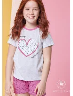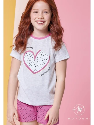 Dívčí pyžamo od španělské značky Muydemi. Pyžamo se skládá z trička s krátkým rukávem s obrázky a z jednobarevných kraťásků.
