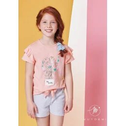 Dívčí pyžamo od španělské značky Muydemi. Pyžamo se skládá z trička s krátkým rukávem s obrázky a z jednobarevných kraťásků.