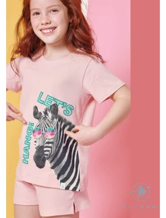 Dívčí pyžamo od španělské značky Muydemi. Pyžamo se skládá z trička s krátkým rukávem s obrázky a z jednobarevných kraťásků.