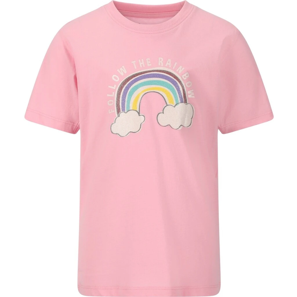 Rozjasněte šatník vaší malé princezny tímto veselým tričkem s potiskem duhy a nápisem „FOLLOW THE RAINBOW“.