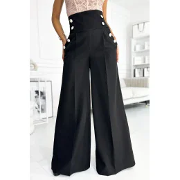 Elegantní široké kalhoty s vysokým sedem a zlatými knoflíky. Jsou vyrobeny z hladké matné tkaniny v černé barvě. Značka Numoco. Polský výrobek.