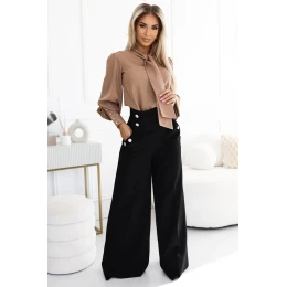 Elegantní široké kalhoty značky Numoco jsou klasickým návrhem ideálním na formální a večerní příležitosti. Vyrobené z hladkého, matného materiálu v černé barvě, vynikají vysokým pasem a efektními zlatými knoflíky, které jim dodávají eleganci. Jejich pohodlný a zároveň stylový střih zaručuje pohodlí nošení a nadčasový vzhled. Polský výrobek, vytvořený s ohledem na ženy ocení eleganci a kvalitu.