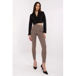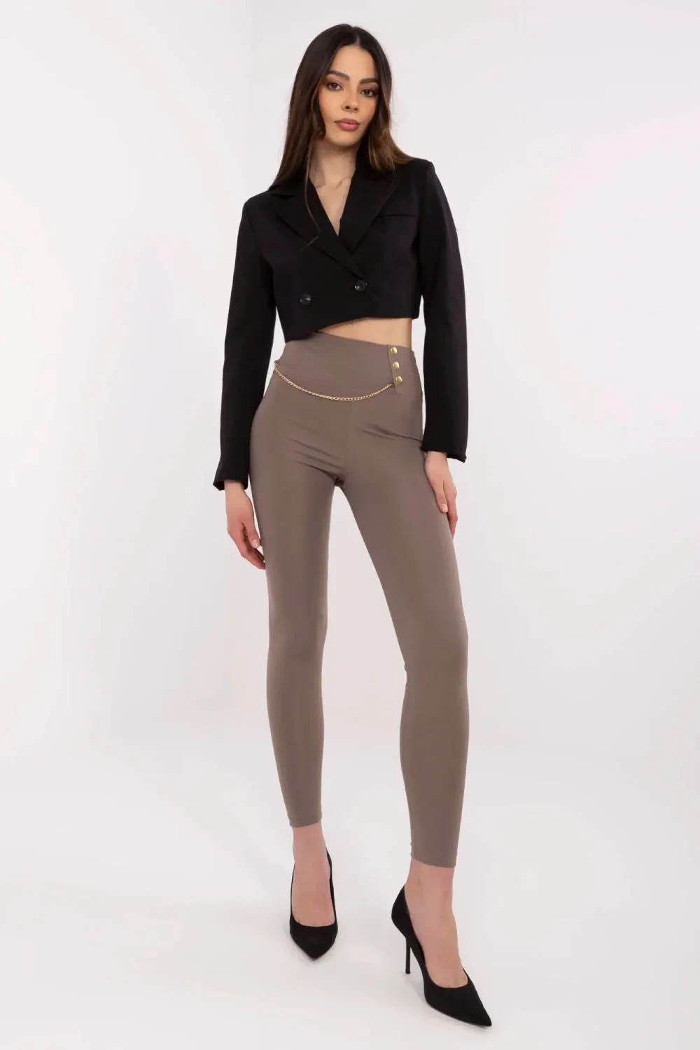 Elegantní legíny s dlouhými nohavicemi pro ženy, ideální jak do každodenního nošení do práce, tak i na večírek. Vyrobené z elastického materiálu z kombinace polyesteru a elastanu, zaručují perfektní přiléhání k postavě a pohodlí po celý den. Model s hladkým vzorem a se zužujícími se nohavicemi krásně zdůrazňuje tvary, a vysoký pas zajišťuje skvělé přiléhání v oblasti pasu a dodatečný pocit pohodlí. Bez kapes a zapínání mají legíny čistý a moderní střih. Jemným, ale zároveň efektním prvkem je ozdobný řetízek, který celku dodává eleganci a dělá z legín skvělý kousek i pro více společenské stylizace.