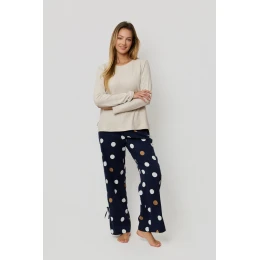 Elegancka i niezwykle kobieca piżama damska Oceane to idealne połączenie wygody, stylu i jakości. Wykonana z miękkiej wiskozy, zapewnia komfort i swobodę ruchów przez całą noc. Górna część zestawu to prążkowana koszulka z długim rękawem, okrągłym dekoltem i subtelnymi rozcięciami po bokach. Do kompletu dołączone są długie spodnie z wiskozowej tkaniny, ozdobione modnym printem w grochy. Spodnie posiadają kieszenie na biodrach oraz rozcięcia u dołu nogawek, zakończone uroczymi kokardkami. Całość prezentuje się stylowo i elegancko, doskonale sprawdzając się zarówno do snu, jak i domowego relaksu.