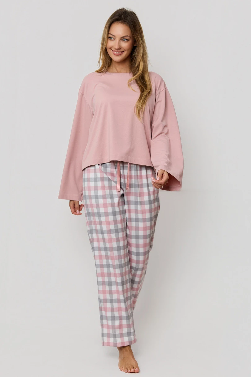 Uzupełnieniem zestawu są długie spodnie w stylową kratkę, wykonane z przyjemnej w dotyku mieszanki wiskozy. W pasie zastosowano satynową kokardkę z możliwością regulacji obwodu, dzięki czemu piżama idealnie dopasowuje się do sylwetki i daje poczucie maksymalnej wygody. Całość zapakowana jest w foliowy worek – świetnie sprawdzi się również jako prezent.
